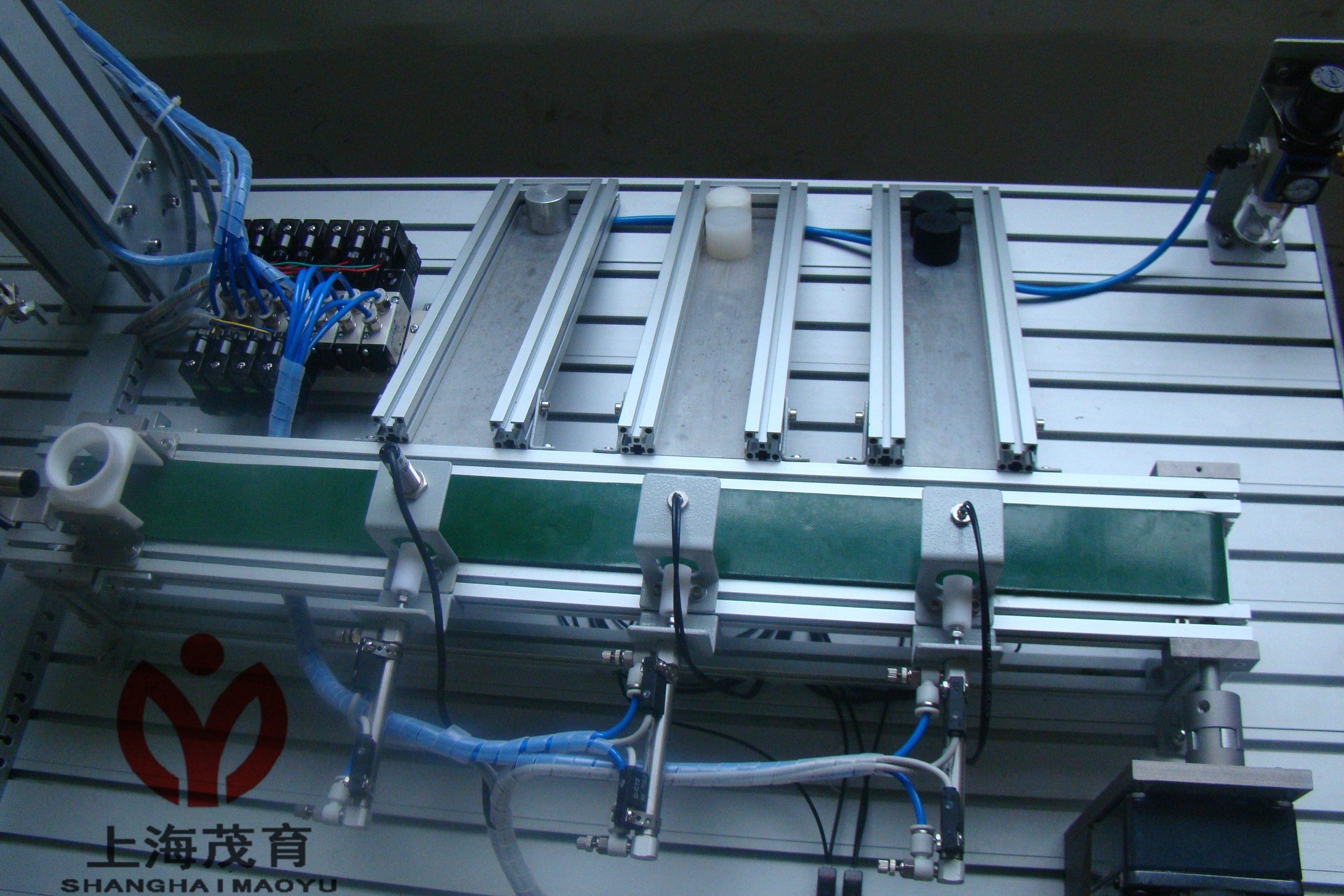 單出桿氣缸3只,金屬傳感器1只,光傳感器2只,磁性開關(guān)6只,物件導(dǎo)槽3個(gè),單控電磁換向閥3只 |