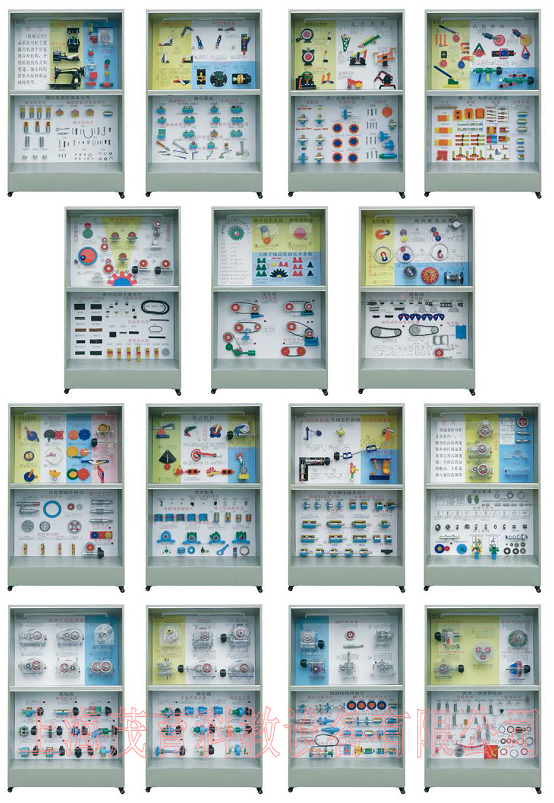 | 第二柜 平面連桿機(jī)構(gòu)的基本形式 | 鉸鏈四桿機(jī)構(gòu):曲柄搖桿機(jī)構(gòu)2件、雙曲柄機(jī)構(gòu)、雙搖桿機(jī)構(gòu)2件。單移動(dòng)副機(jī)構(gòu):曲柄滑塊機(jī)構(gòu)、曲柄搖塊機(jī)構(gòu)、轉(zhuǎn)動(dòng)導(dǎo)桿機(jī)構(gòu)、移動(dòng)導(dǎo)桿機(jī)構(gòu)。雙移動(dòng)副機(jī)構(gòu):曲柄移動(dòng)導(dǎo)機(jī)構(gòu)、雙滑塊機(jī)構(gòu)、雙轉(zhuǎn)塊機(jī)構(gòu) |