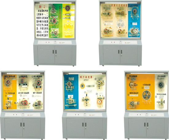 減速器陳列柜-是根據(jù)大中專院校,職業(yè)學(xué)校的教學(xué)大綱設(shè)計(jì)的機(jī)械陳列柜,《減速器》電化教學(xué)設(shè)備。減速器陳列柜共5個(gè)柜25種減速器及1個(gè)控制臺(tái),用CD解說(shuō)遙控控制,聲控同步進(jìn)行演示機(jī)械模型,加強(qiáng)對(duì)機(jī)械專業(yè)的學(xué)生的理論學(xué)習(xí),使用范圍增強(qiáng)認(rèn)識(shí),加深理解,是機(jī)械專業(yè)系不可缺少的理想教具設(shè)備。