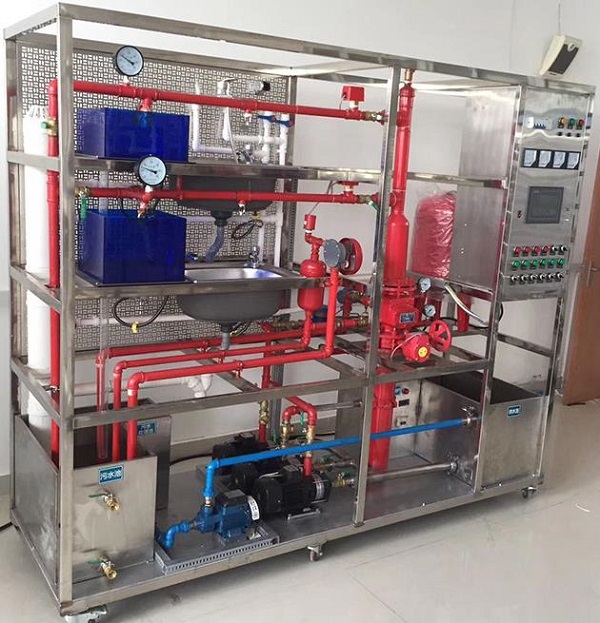 2、消防給水系統(tǒng):主要有給水箱、噴淋泵、穩(wěn)壓罐、濕式報警閥、壓力開關(guān)、水流指示器、消防給水管道、閉式噴淋頭等組成。管路采用鍍鋅管進行設(shè)計,可進行鍍鋅管的切割、套絲、安裝和通水試驗操作,通過控制系統(tǒng)可實現(xiàn)噴淋滅火功能。
