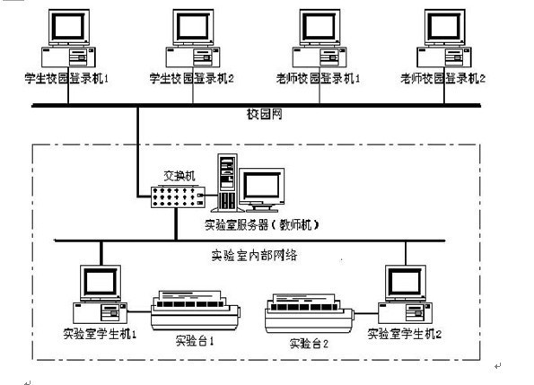 實驗室內(nèi)部網(wǎng)采用星型結構,實驗室服務器由教師端計算機擔任,實驗數(shù)據(jù)采集由學生端計算機執(zhí)行。