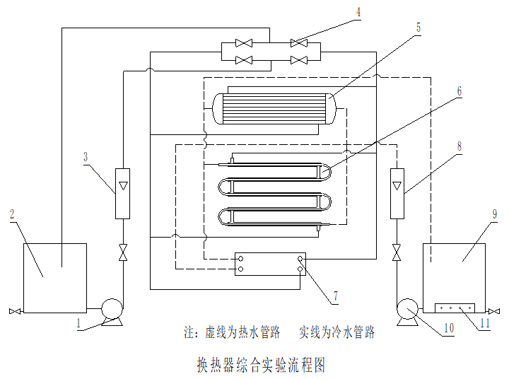 1.冷水泵 2冷水箱 3.冷水流量計(jì) 4.冷水順逆流閥門組 5.列管式換熱器 6.套管式換熱器 7.板式換熱器 8.熱水流量計(jì) 9.熱水箱 10. 熱水泵 11 電加熱器 巡檢儀溫度顯示:T1-熱水進(jìn)口溫度;T2-熱水出口溫度; T3-冷水進(jìn)口溫度;T4-冷水出口溫度