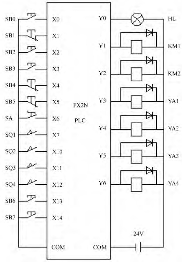 | 電磁鐵YA2 得電按鈕SB7 | X14 |