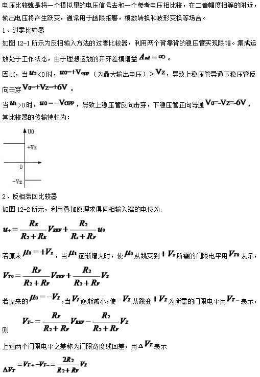 電壓比較就是將一個模擬量的電壓信號去和一個參考電壓相比較,在二者幅度相等的附近,輸出電壓將產(chǎn)生躍變,通常用于越限報警,模數(shù)轉(zhuǎn)換和波形變換等場合。