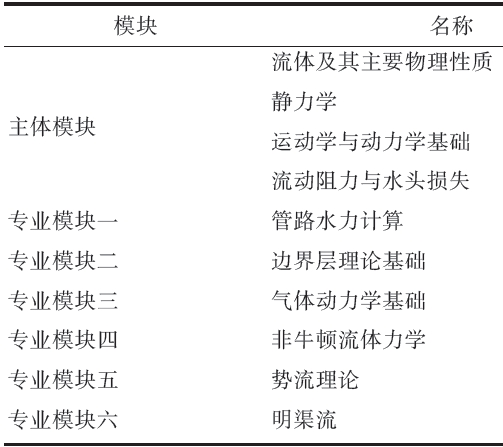 為體現(xiàn)各專業(yè)的授課內(nèi)容能更有利于以后在專業(yè)課上的應(yīng)用,特將授課內(nèi)容分成主體模塊和不同專業(yè)模塊,將主體模塊與不同專業(yè)模塊組合到不同專業(yè),以體現(xiàn)課程的“專業(yè)化”,表1 是各模塊的授課內(nèi)容。主體模塊主要包括流 體屬性、流體靜力學(xué)、運(yùn)動學(xué)和動力學(xué)基礎(chǔ)、水頭損失與流動阻力,而專業(yè)模塊則包含與各專業(yè)相關(guān)的不同內(nèi)容,如管路水力計(jì)算,邊界層理論基礎(chǔ)、氣體動力學(xué)基礎(chǔ)、非牛頓流體基礎(chǔ)、勢流理論和明渠流,根據(jù)不同專業(yè)的特點(diǎn),采用主體模塊加專業(yè)模塊的形式,選擇不同的授課內(nèi)容,比如船舶與海洋工程專業(yè)對于長管的水力計(jì)算以及孔口管嘴泄流相關(guān)性較小,可以選擇與船舶設(shè)計(jì)相關(guān)性較大的勢流理論和明渠模塊,而對于熱能與動力工程專業(yè)則可以選擇邊界層理論基礎(chǔ)和氣體動力學(xué)基礎(chǔ)模塊;油氣儲運(yùn)和建筑與環(huán)境專業(yè)則選擇管路水力計(jì)算加邊界層基礎(chǔ)與氣體動力學(xué)基礎(chǔ)模塊;石油工程專業(yè)則主體模塊加專業(yè)模塊一和四。