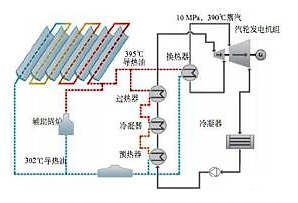槽式太陽(yáng)能熱發(fā)電系統(tǒng)全稱為槽式拋物面反射鏡太陽(yáng)能熱發(fā)電系統(tǒng),是將多個(gè)槽型拋物面聚光集熱器經(jīng)過(guò)串并聯(lián)的排列,加熱工質(zhì),產(chǎn)生高溫蒸 汽,驅(qū)動(dòng)汽輪機(jī)發(fā)電機(jī)組發(fā)電。