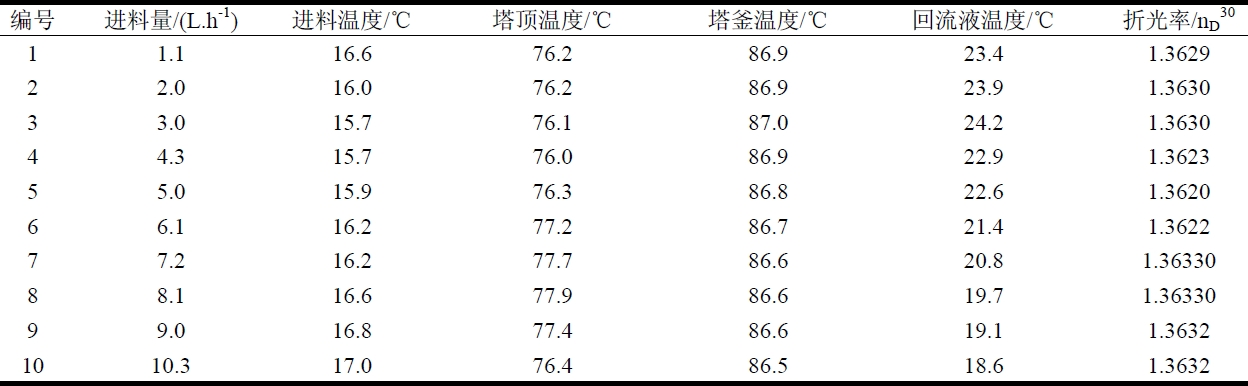 表3 調(diào)節(jié)不同進料液流速時塔頂餾分的折光率