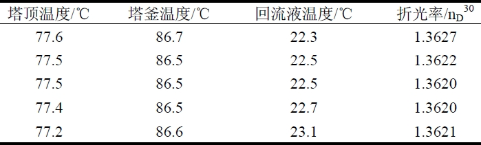 表2 調(diào)節(jié)不同回流比時塔頂餾分折光率