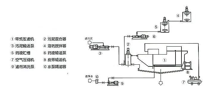 1.板框式污泥脫水機:在密封狀態(tài)下,由高壓泵驅動的污泥被板框擠出,使污泥中的水通過濾布排出,達到脫水的目的。