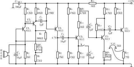 2構(gòu)成了一個(gè)具有深度負(fù)反饋的兩級(jí)直接耦合放大電路,以使電路的輸入電阻減低并展寬頻帶,并具有非常穩(wěn)定的靜態(tài)工作點(diǎn),作為微音放大器的輸入級(jí)。輸入信號(hào)通過(guò)微音活筒接入VT