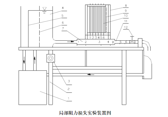 1.自循環(huán)供水器 2.實(shí)驗(yàn)臺(tái) 3.可控硅無(wú)極調(diào)速器(本裝置無(wú))4.恒壓水箱5.溢流板6.穩(wěn)水孔板 7.突然擴(kuò)大實(shí)驗(yàn)管段 8.測(cè)壓計(jì) 9.滑動(dòng)測(cè)量尺 10.測(cè)壓管 11.突然收縮實(shí)驗(yàn)管段 12.實(shí)驗(yàn)流量調(diào)節(jié)閥實(shí)驗(yàn)管道由小→大→小三種已知管徑的管道組成,共設(shè)有六個(gè)測(cè)壓孔,測(cè)壓孔1~3和3~6分別測(cè)量突擴(kuò)和突縮圓管的局部阻力。其中測(cè)孔1位于突擴(kuò)界面處,用于測(cè)量小管出口端壓強(qiáng)值。