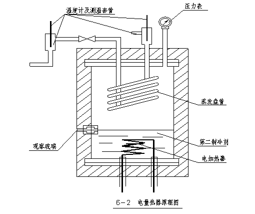 1.電量熱器法是間接測量壓縮機制冷量的一種裝置,它的基本原理是利用電加熱器發(fā)出的熱量來抵消壓縮機的制冷量,從而達到平衡。電量熱器是一個密閉容器,如圖6—2所示。電量熱器的頂部裝有蒸發(fā)器盤管,底部裝有電加熱器,浸沒于一種容易揮發(fā)的第二冷劑(常用R11、R12)中。試驗時,接通電加熱器,加熱第二制冷劑,使之蒸發(fā),第二制冷劑飽和蒸氣在頂部蒸發(fā)盤管被冷凝,又重新回到底部。而蒸發(fā)盤管中的低壓液態(tài)制冷劑被第二制冷劑蒸氣加熱而氣化,返回制冷壓縮機。實驗儀在試驗工況下達到穩(wěn)定運行時,供給電加熱器的電功率正好抵消制冷量,從而使第二制冷劑的壓力保持不變。