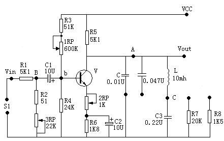 )經(jīng)C1耦合送至V的b-e之間,經(jīng)放大后,通過(guò)LC選頻,選出頻率為f0的信號(hào)送到負(fù)載R7或R8上。