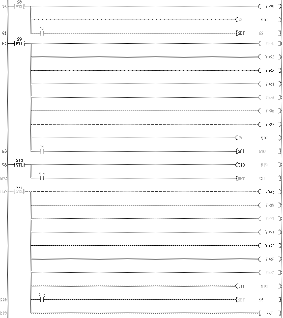 84 STL S9 85 OUT Y001 86 OUT Y002 87 OUT Y003 88 OUT Y004 89 OUT Y005 90 OUT Y006 91 OUT Y007 92 OUT T9 K10 95 LD T9 96 SET S10 98 STL S10 99 OUT T10 K10 102 LD T10 103 SET S11 105 STL S11 106 OUT Y001 113 OUT T11 K10 116 LD T11 119 RET |