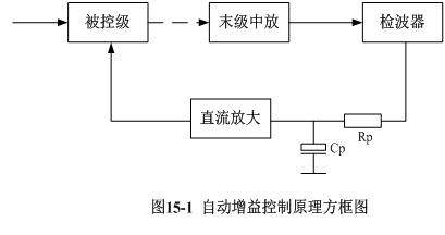 為實現(xiàn)AGC,首先要有一個隨外來信號強度變化的電壓,然后用這一電壓去改變被控制級增益。這一控制電壓可以從二極管檢波器中獲得,因為檢波器輸出中,包含有直流成分,并且其大小與輸入信號的載波大小成正比,而載波的大小代表了信號的強弱,所以在檢波器之后接一個RC低通濾波器,就可獲得直流成分。AGC的原理如圖15-1所示,這種反饋式調(diào)整系統(tǒng)也稱閉環(huán)調(diào)整系統(tǒng)。