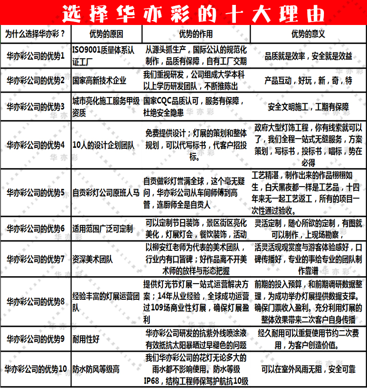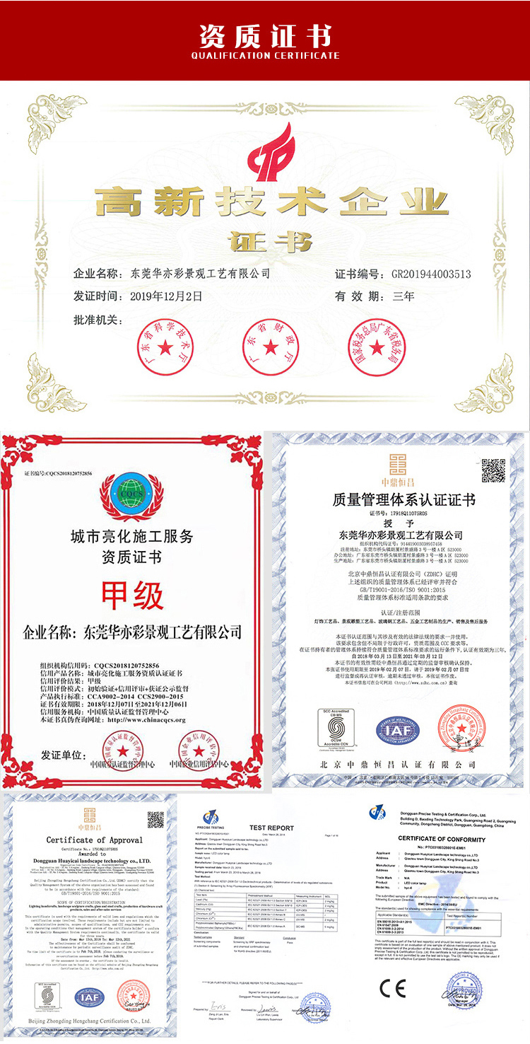 其次看資質(zhì):比如華亦彩公司是高新科技企業(yè),城市亮化工程服務(wù)施工資質(zhì)
